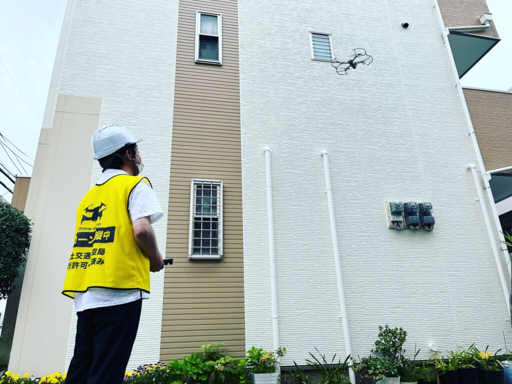 当社では、最新ドローンによる外壁調査を行っています。足場を組むことなく、高画質カメラや赤外線センサーで建物の劣化・ひび割れ・雨漏りの原因を正確に確認。人の手が届かない場所も安全に点検でき、調査コストの削減にもつながります。